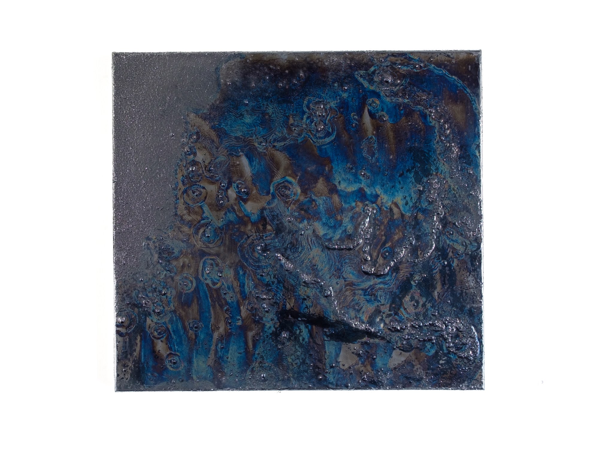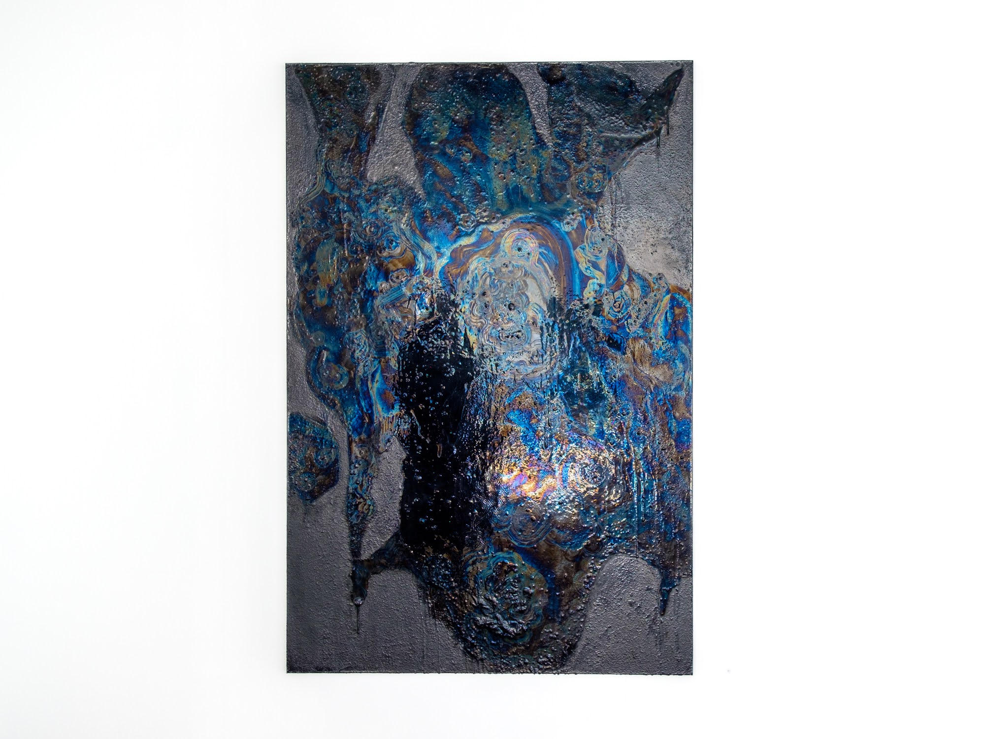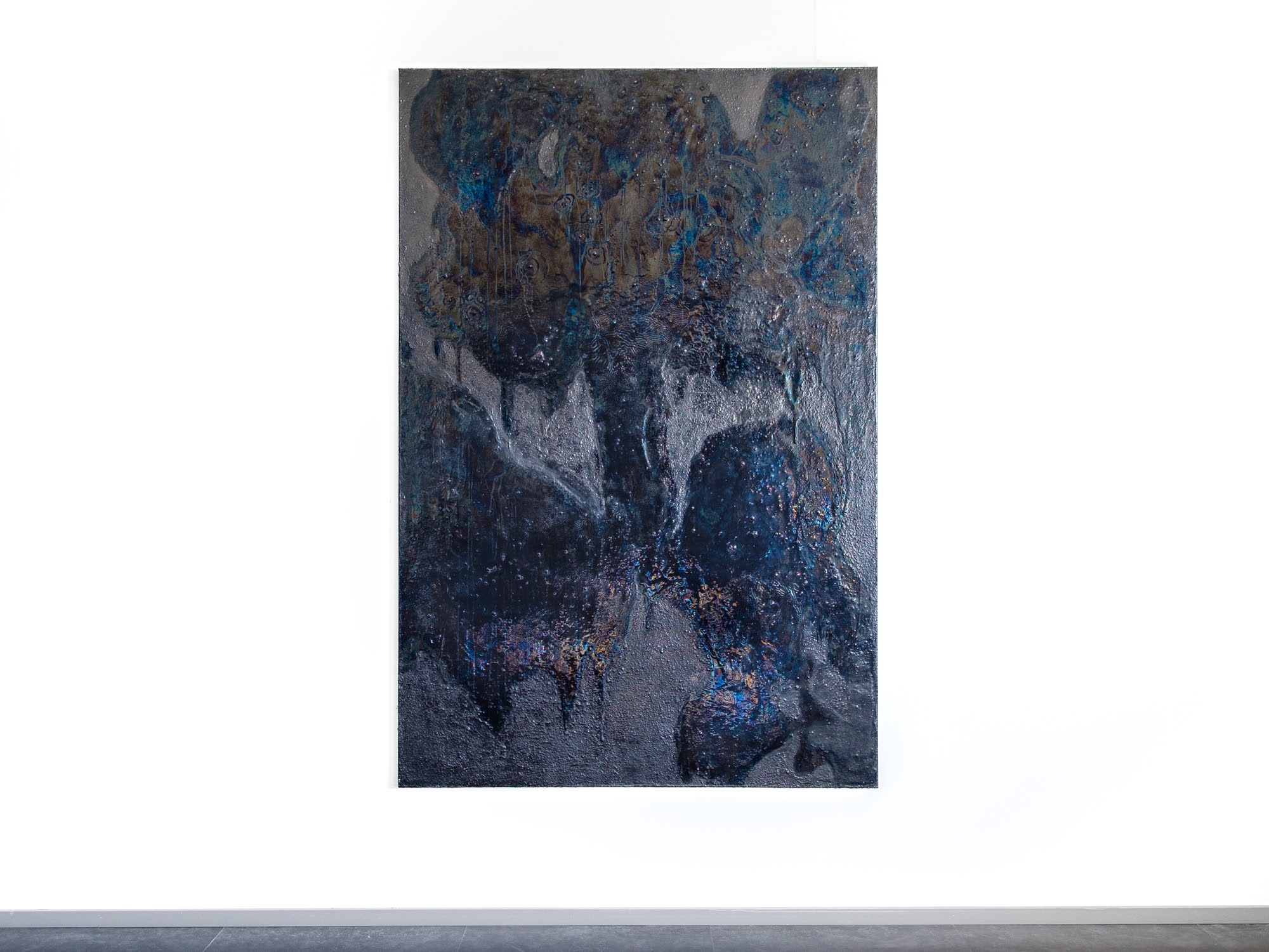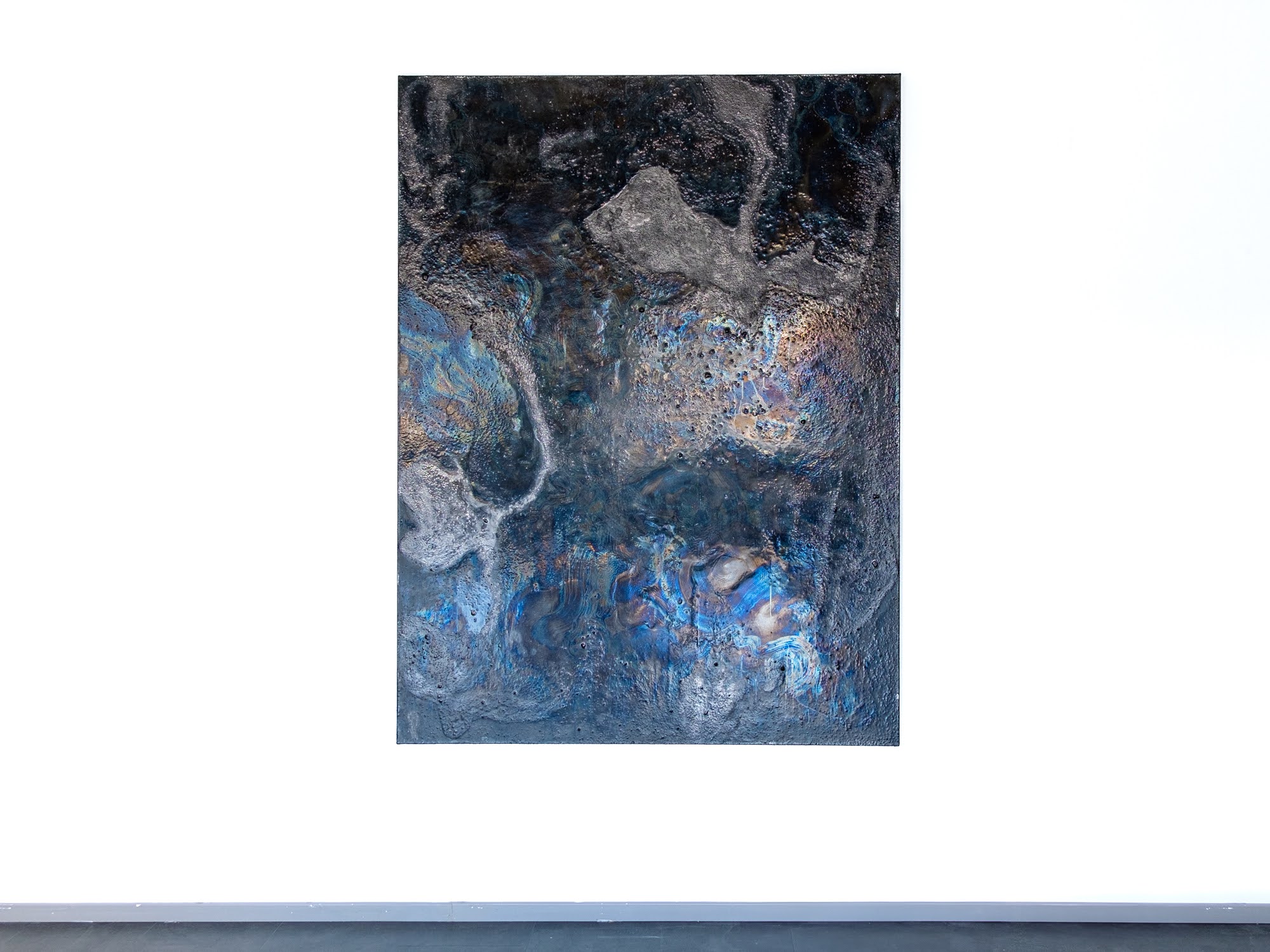 THESE LATEST WORKS HAVE BEEN CREATED using sea salt and the last coal from the Salmisaari power plant. The dark, glassy layers of paint resemble a rapidly melting ice landscape. The reflective surfaces of the works draw us dangerously close and awaken in us a similar desire to look and touch. In Lowe’s paintings, coal transforms into a black mirror where the viewer must confront themselves. The viewer’s shadow falls onto the image, disrupting the reflection like ripples on the surface of water.