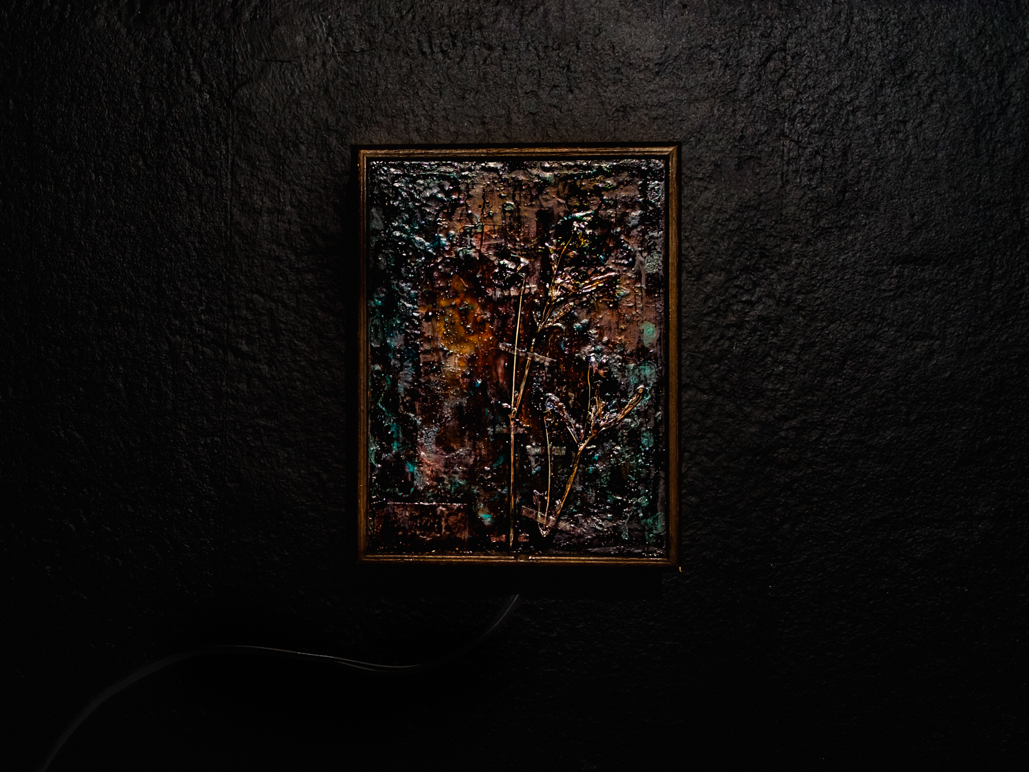 The Thermophobia Paintings are small plant still lives painted on copperplate using salts, acids, alkalies and various corrosive substances instead of pigment to produce colour. These images are hidden under a layer of pigment that is sensitive to changes in temperature instigated by an electrical component.